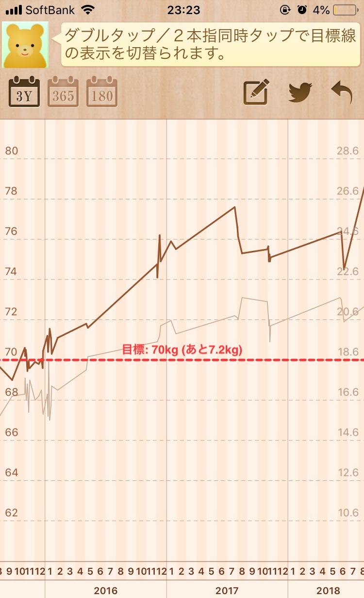 ちなみに、以下のグラフで、いまよりちょっと前に、少し下がってるのは、前回ダイエットの形跡。